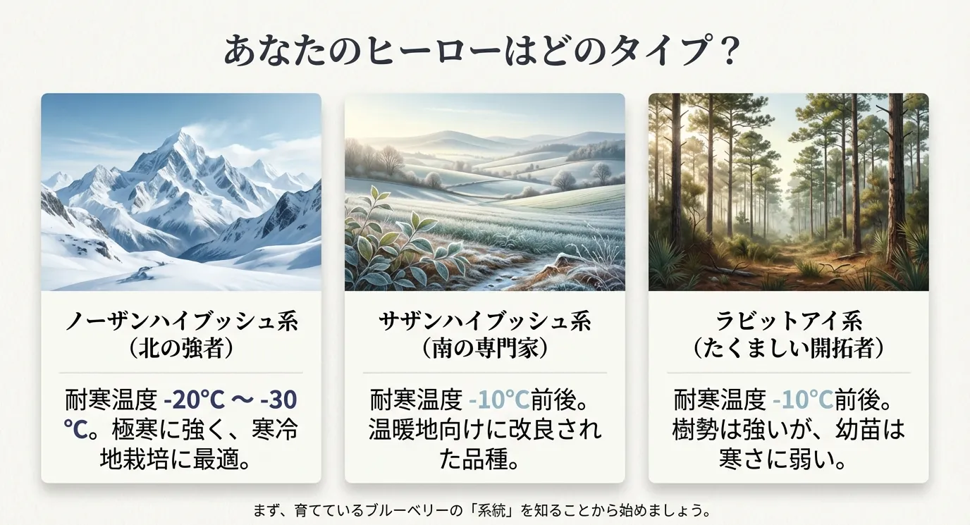 ブルーベリーの冬越しを考える上で、最も重要なのが育てている品種の「系統」を正しく把握することです。ブルーベリーには大きく分けて、ノーザンハイブッシュ系、サザンハイブッシュ系、ラビットアイ系の3つのグループが存在します。