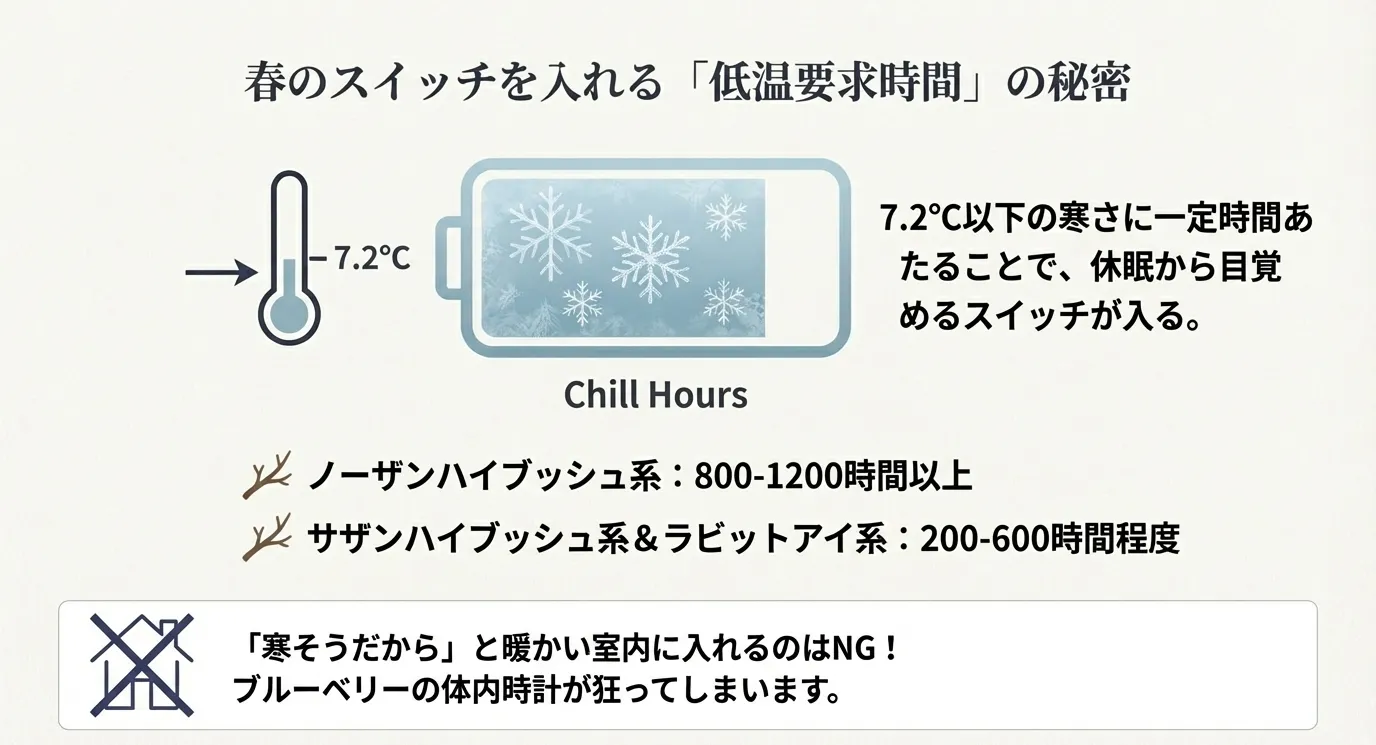 ブルーベリーの冬越しにおいて、単に「寒さから守る」こと以上に重要なのが「低温要求時間(チルユニット)」の確保です。ブルーベリーは冬の寒さを経験することで休眠に入り、その後一定の時間、低い温度にさらされることで初めて休眠から覚める「休眠打破」という生理現象を持っています。