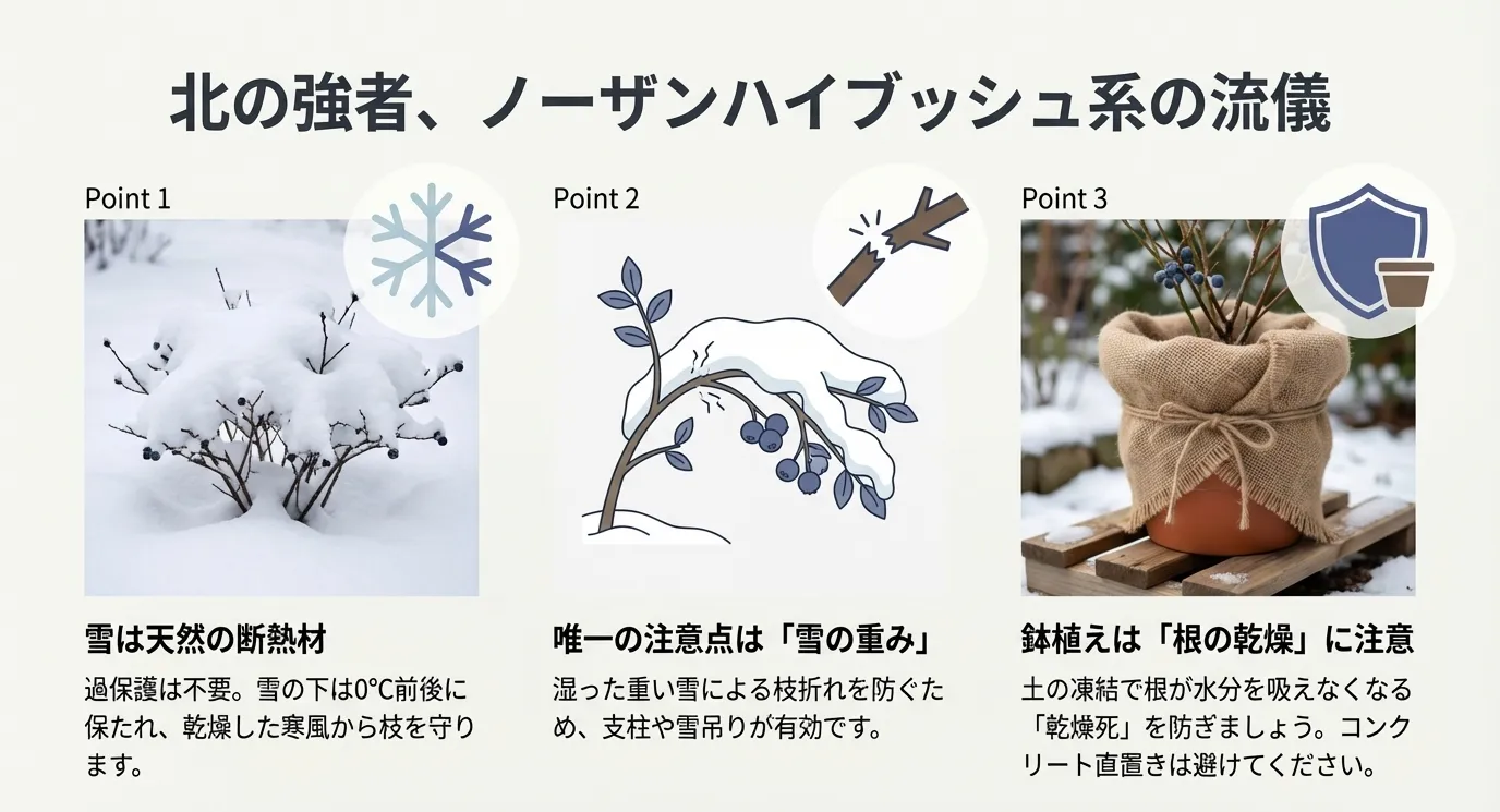 もう一つの課題は、鉢植えの凍結対策です。ノーザンハイブッシュ系自体はマイナス20℃に耐えられても、鉢の中の土が完全に凍結し、それが長期間続くと根が水分を吸えなくなり、結果として「凍死」ではなく「乾燥死」を招くことがあります。