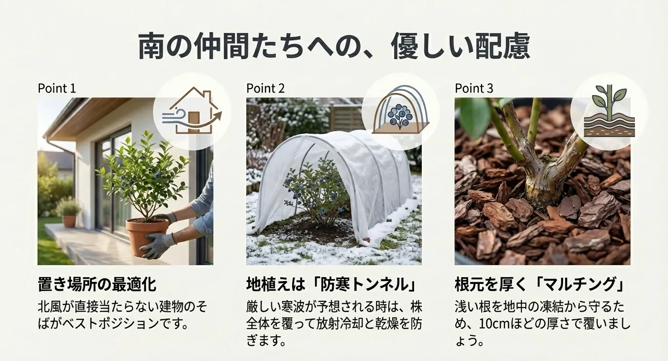 • サザンハイブッシュ系とラビットアイ系の寒さ対策