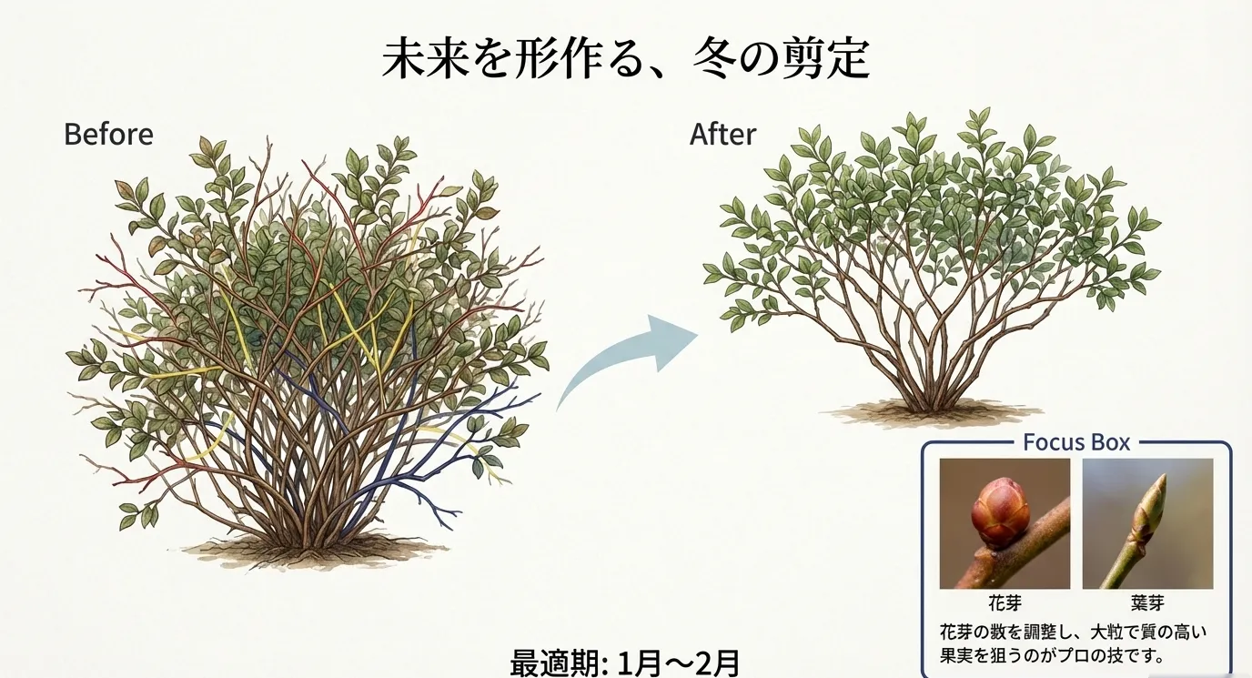 ブルーベリー栽培において、冬の最大の仕事と言えば「剪定」です。落葉して株の骨格がはっきりと見える1月から2月が最適な時期となります。この時期に不要な枝を整理することで、株全体の風通しと日当たりを改善し、栄養を残すべき枝に集中させることができます。