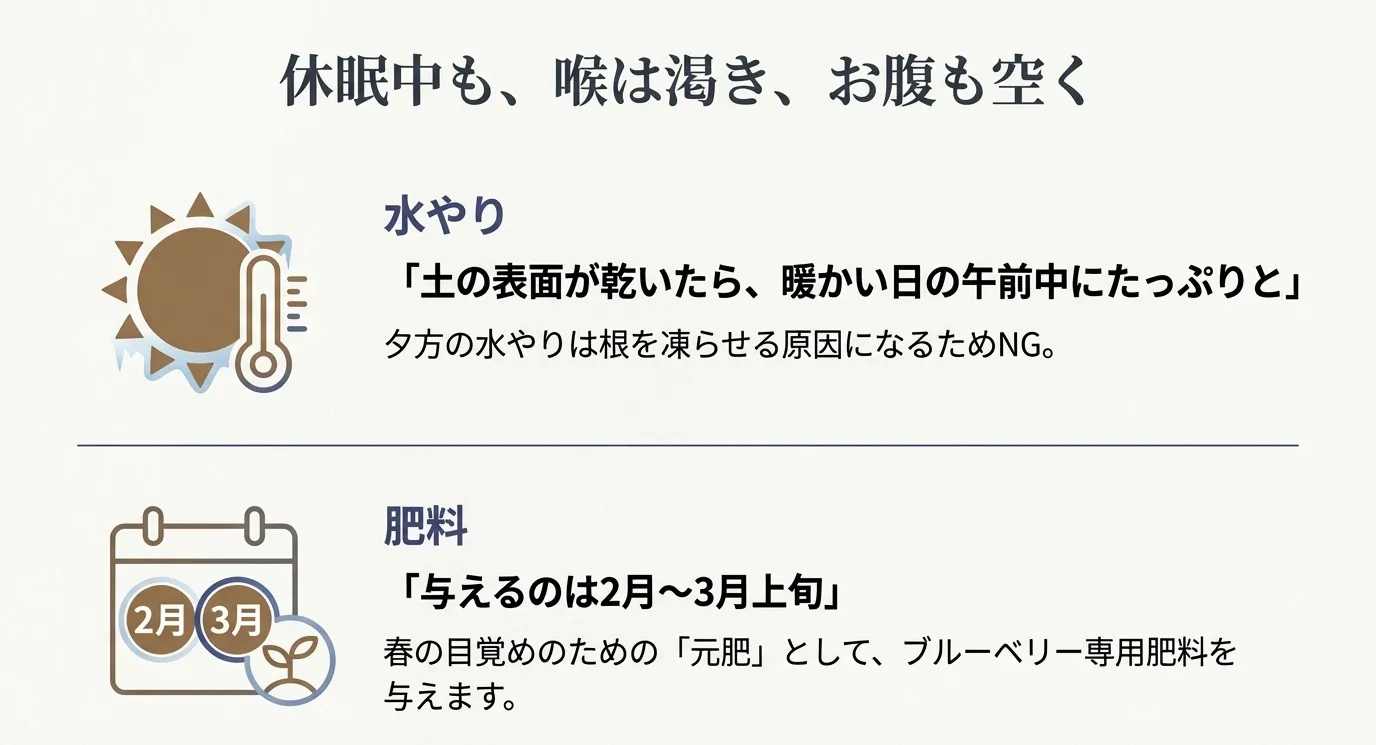 「冬は植物が休んでいるから水やりは不要」という誤解が、ブルーベリーを枯らす最大の原因の一つです。確かに夏場のような激しい吸水はありませんが、ブルーベリーは冬の間も枝や芽から水分を蒸散させています。