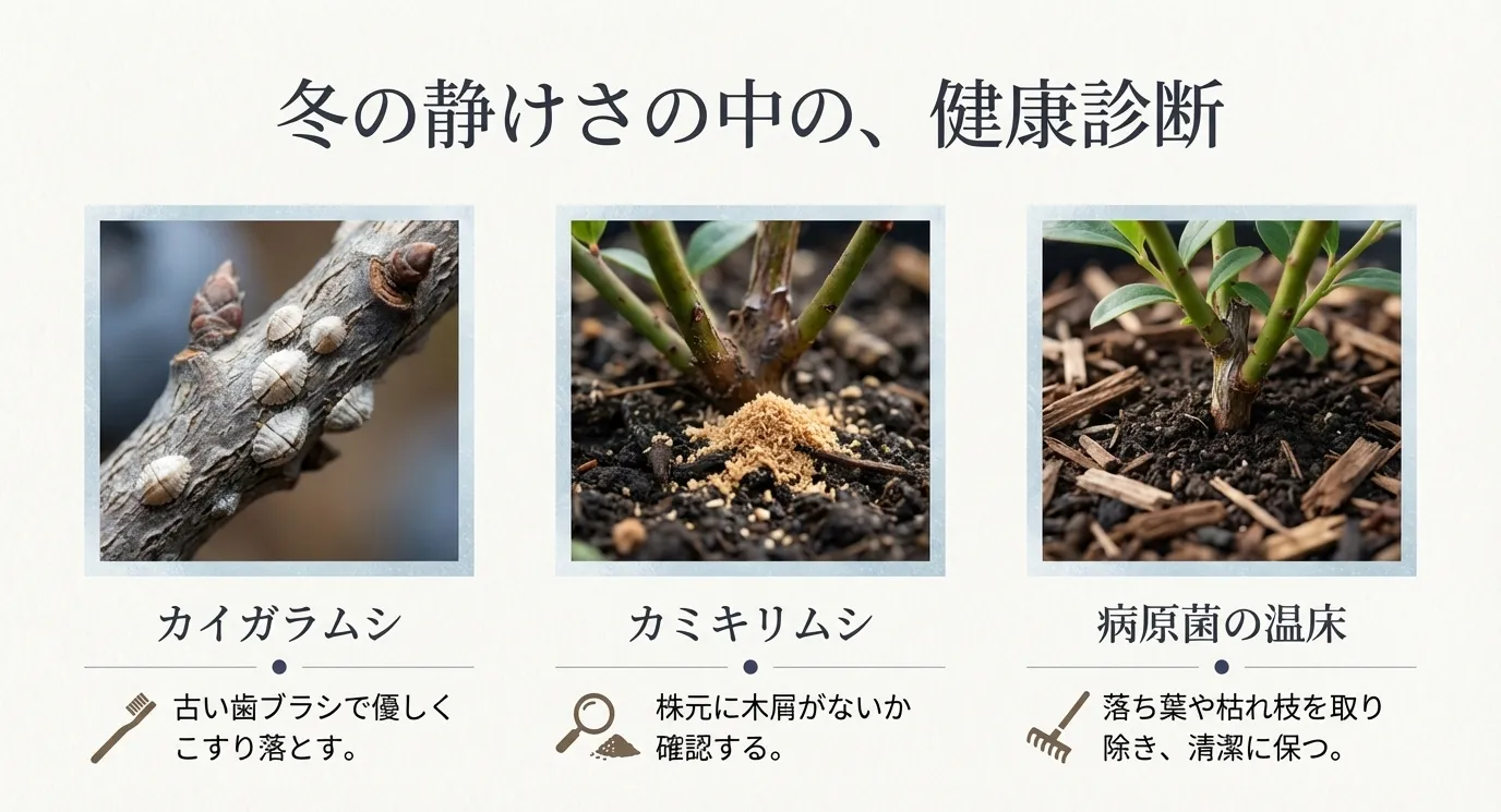 特に注意したいのが「カイガラムシ」です。冬の枝をじっくり観察して、白い小さな塊や、茶色いカサブタのようなものが付着していないか確認してください。カイガラムシは成虫になると硬い殻に覆われ、薬剤が効きにくくなります。