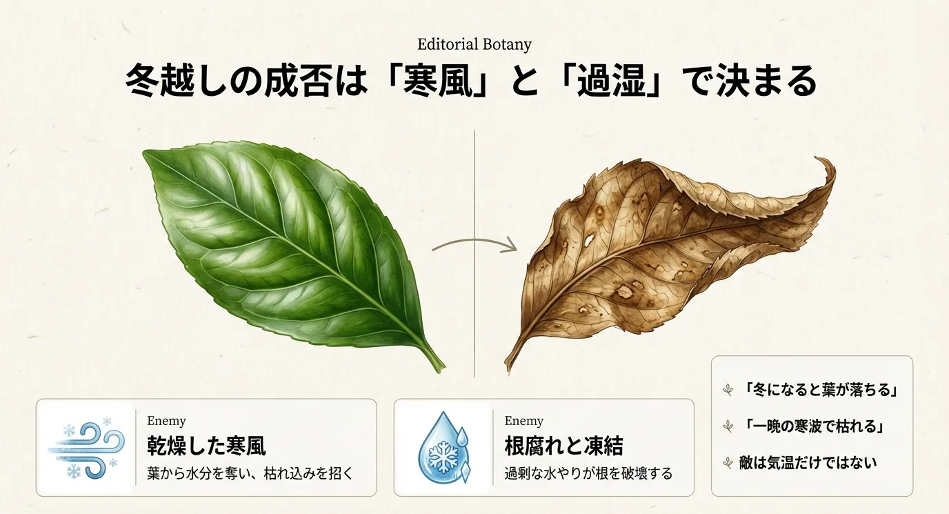 そのため、物理的に風を遮ることが冬越しの成否を分けます。
