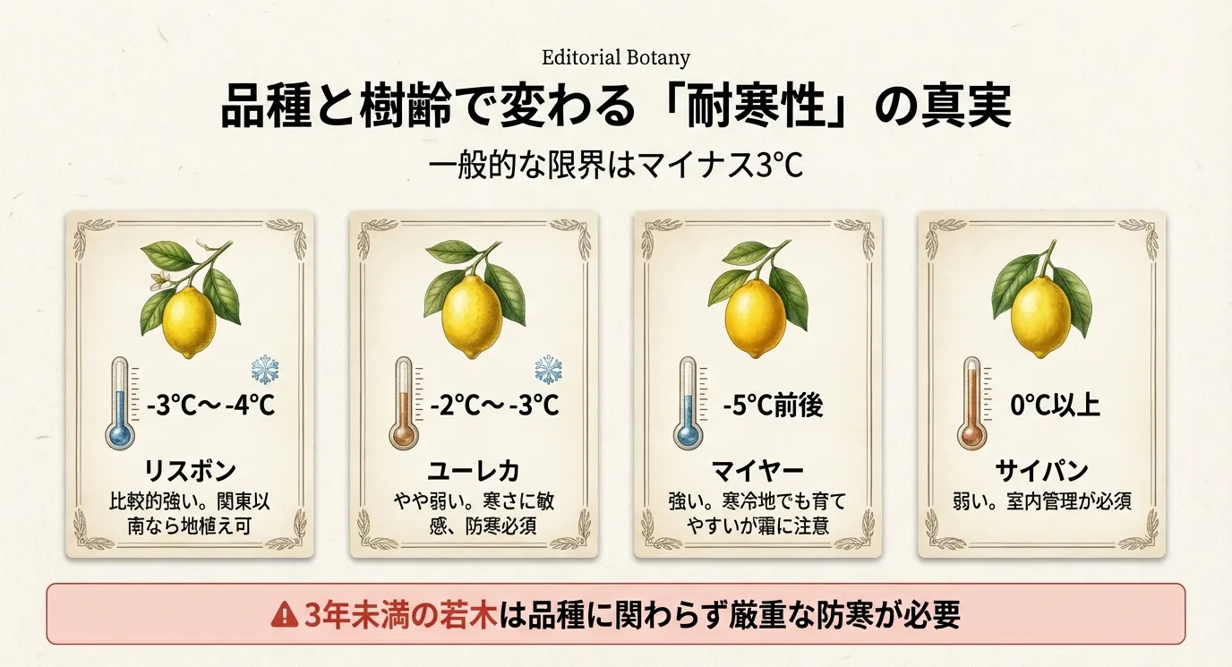 レモンの冬越しを考える上で、まず最初に理解しておくべきなのは、育てている「品種」がどれくらいの寒さに耐えられるかという点です。レモン全般の耐寒温度の目安は、一般的にマイナス3℃前後とされています。しかし、2026年現在流通している品種を比較すると、その強さには明確な差があります。
