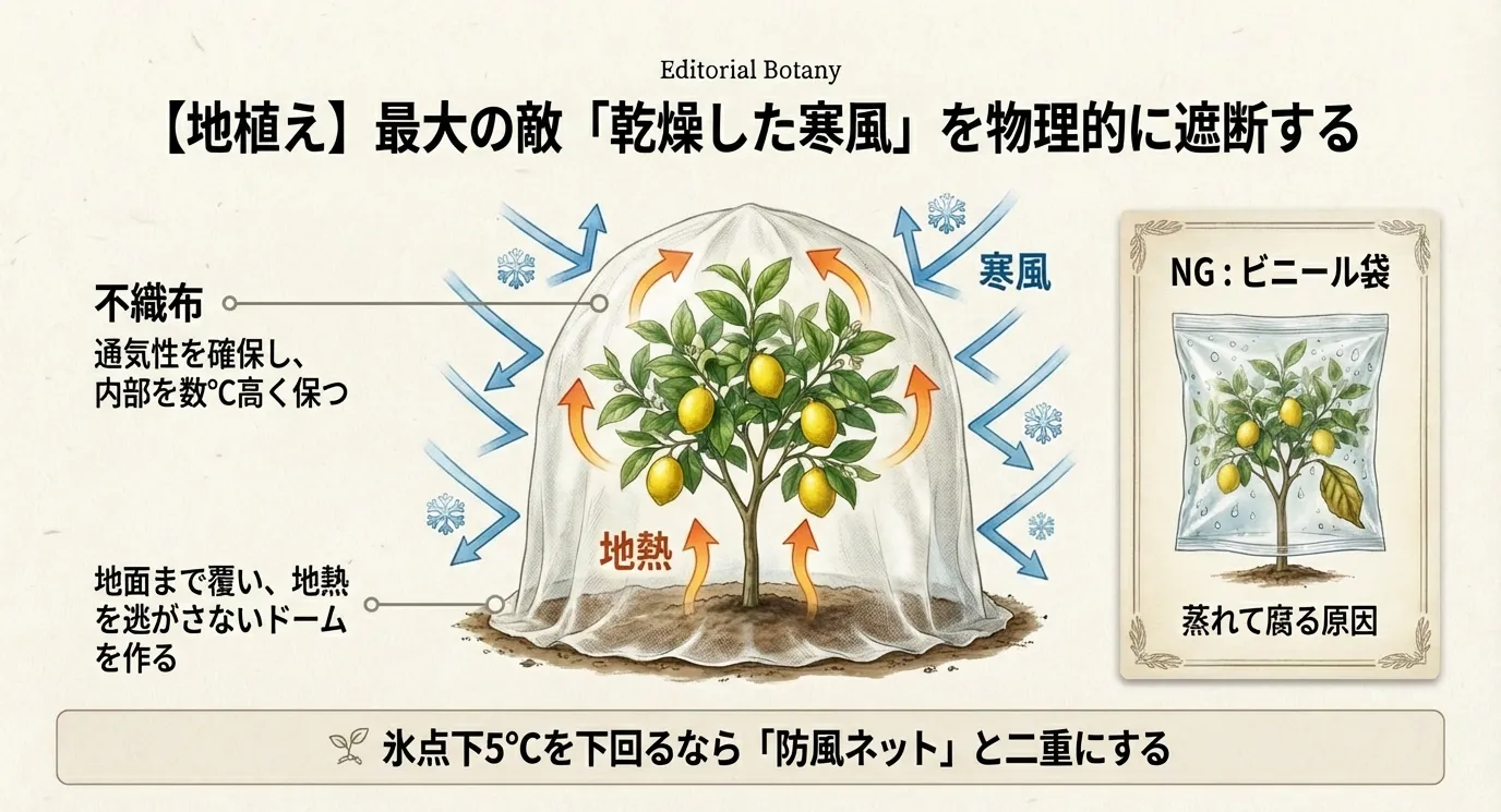 地植えのレモンにとって、冬の最大の敵は「氷点下の気温」そのものよりも、実は「乾燥した寒風」です。冷たい風が常に葉に当たることで、葉から水分が過剰に奪われます。冬は根が休眠状態で吸水能力が落ちているため、蒸散量に吸水が追いつかず、結果として枝が枯れ込んでしまうのです。