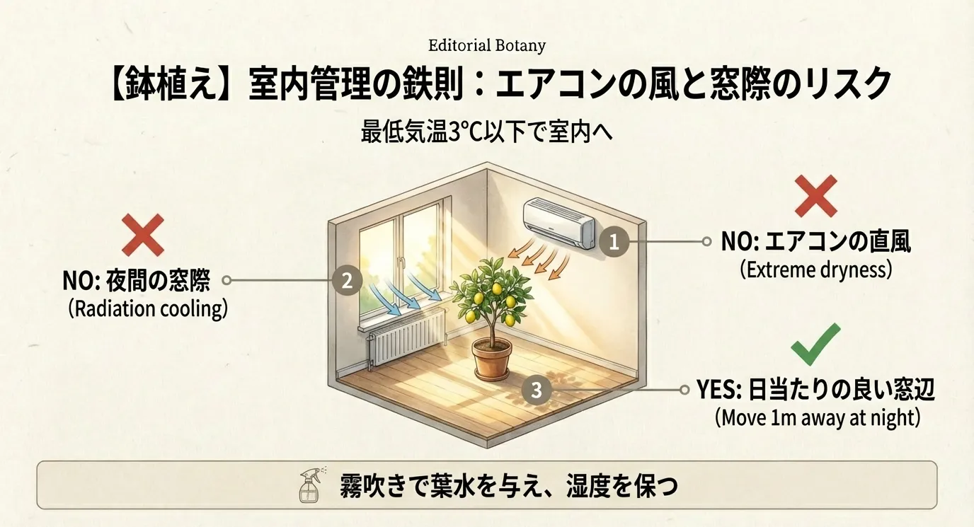 鉢植えでレモンを育てている最大のメリットは、環境に応じて移動ができることです。最低気温が3℃を下回る予報が出始めたら、安全のために室内や軒下へ移動させることを検討しましょう。ただし、室内へ取り込む際にはいくつか注意すべきポイントがあります。