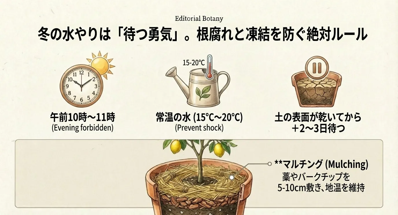 水の温度にひと工夫冬の水道水は非常に冷たいため、そのまま与えると根に「温度ショック」を与えます。バケツに汲み置いて室温に戻した水か、少しだけお湯を混ぜて「常温(15℃〜20℃程度)」にした水を与えるのが、プロの管理テクニックです。