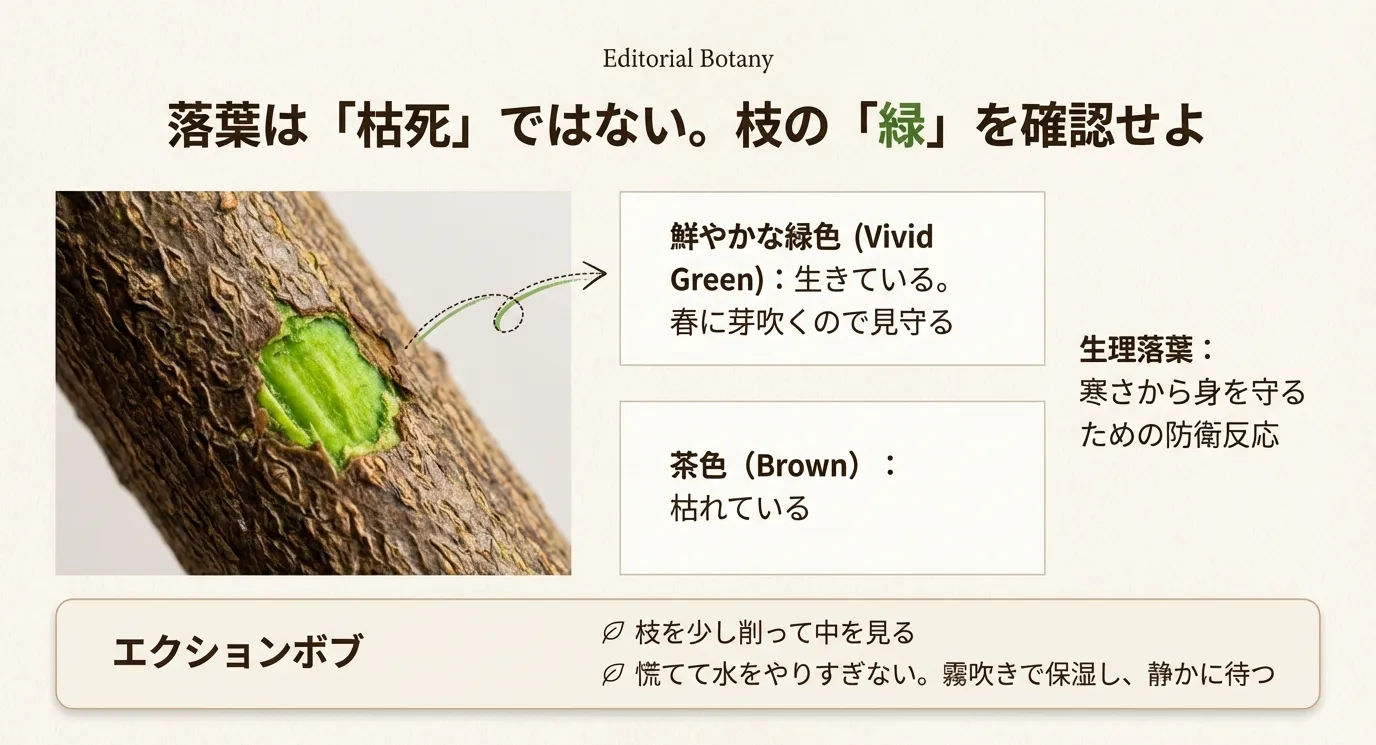 - 寒さで葉が落ちても枝が生きていれば春に芽吹くので見守る