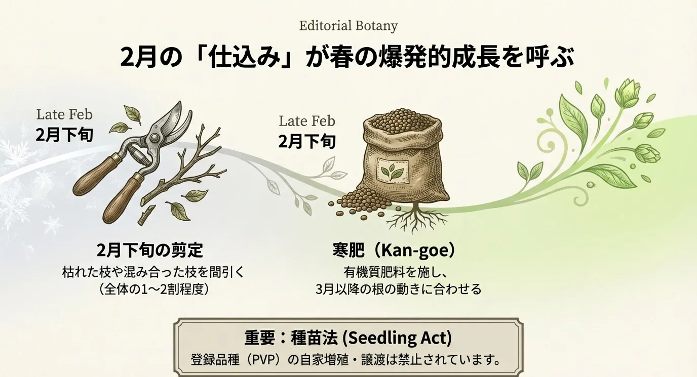 - 春の芽吹きを助ける2月の剪定と寒肥