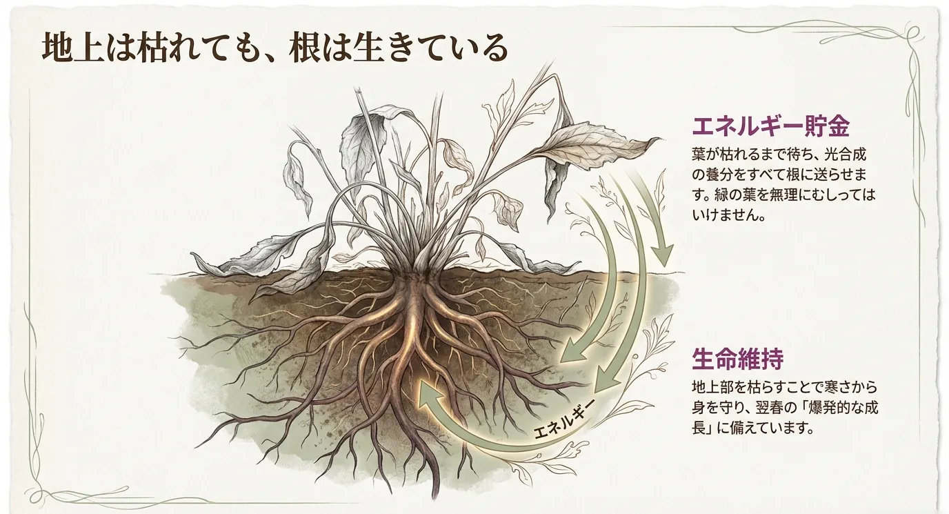 このとき、見た目が悪いからといって無理に緑の葉をむしり取ってはいけません。葉が完全に枯れるまでは、光合成で作られた栄養分が根へと送られ続けているからです。根に十分な栄養が蓄えられることで、翌春に力強い新芽を出すための「貯金」が完了します。