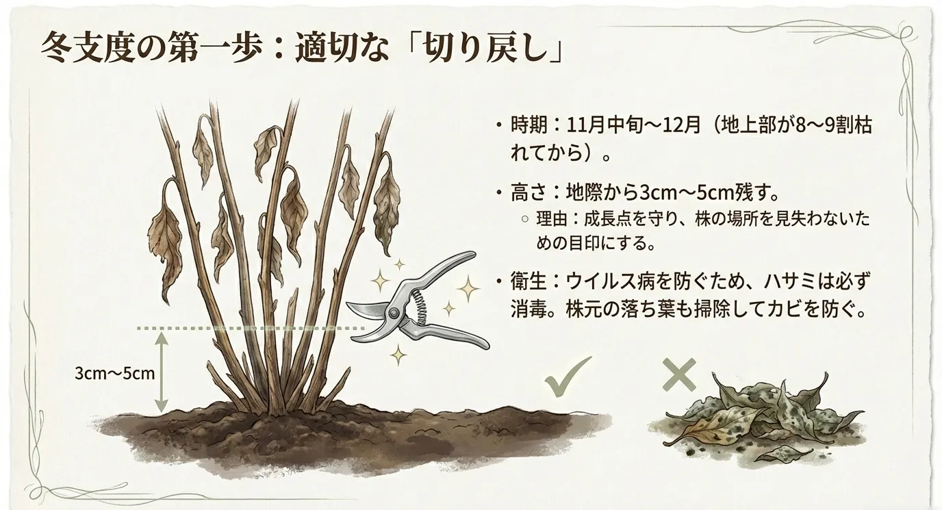 具体的な剪定方法は、地際から3cmから5cm程度の高さで茎を切り揃える方法が一般的です。このとき、あまり深く切りすぎて「成長点」を傷めないよう注意してください。古い茎を少し残しておくことで、冬の間どこに株があるかという目印にもなり、うっかり他の植物を植えてしまったり、踏みつけてしまったりする事故を防げます。