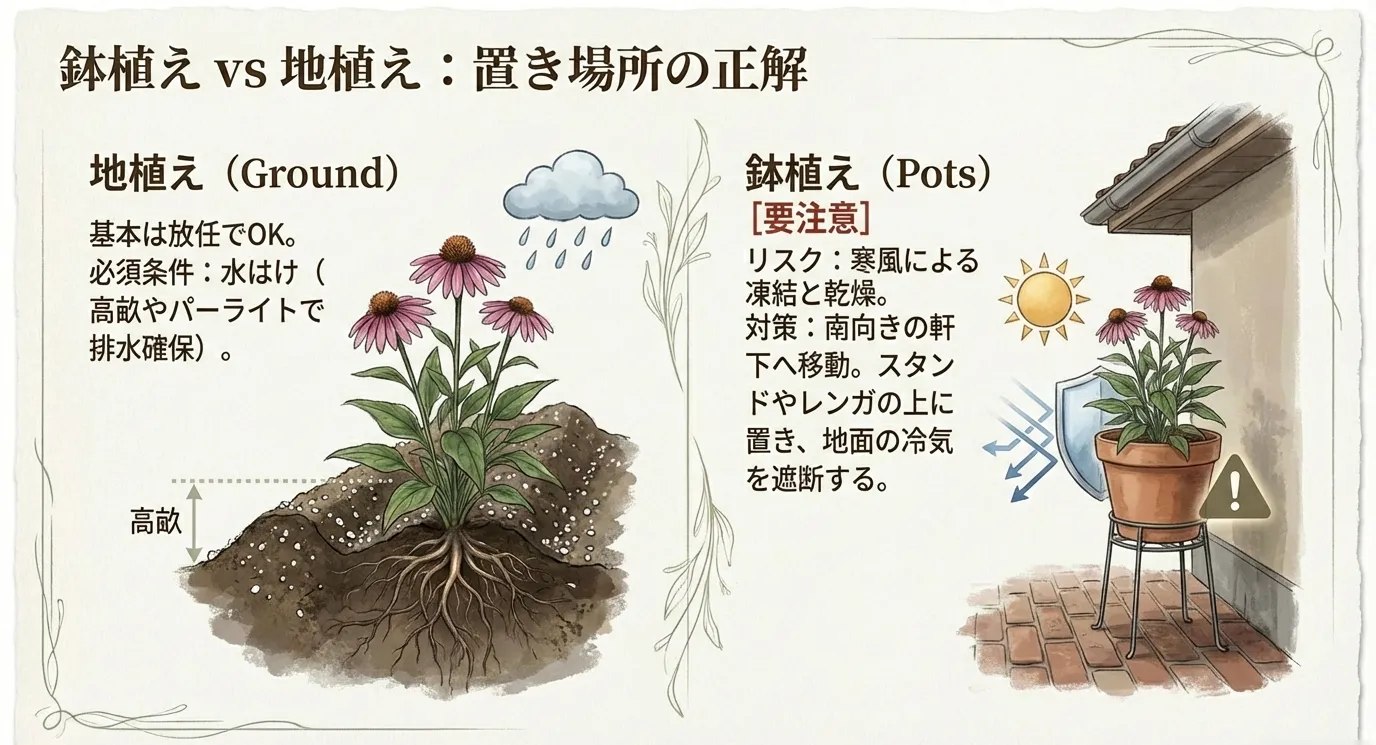 エキナセアの冬越し管理は、地植え(露地栽培)か鉢植えかによって大きく異なります。まず地植えの場合、一度根付いてしまえば非常に安定した環境で冬を越せます。地植えのメリットは地温が急激に変化しにくいことです。