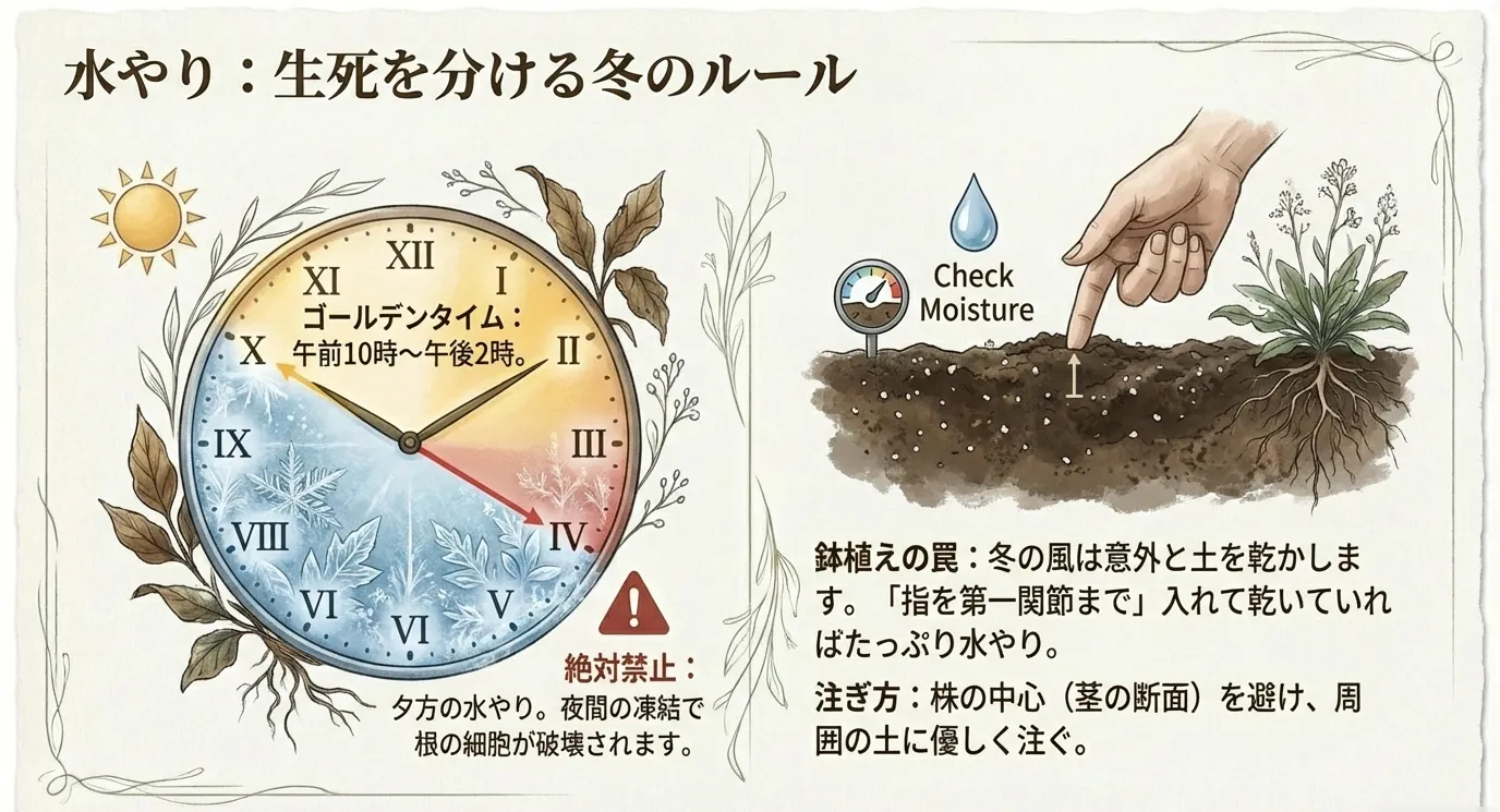 • 冬の夕方以降の水やりは土壌凍結を招くため避ける