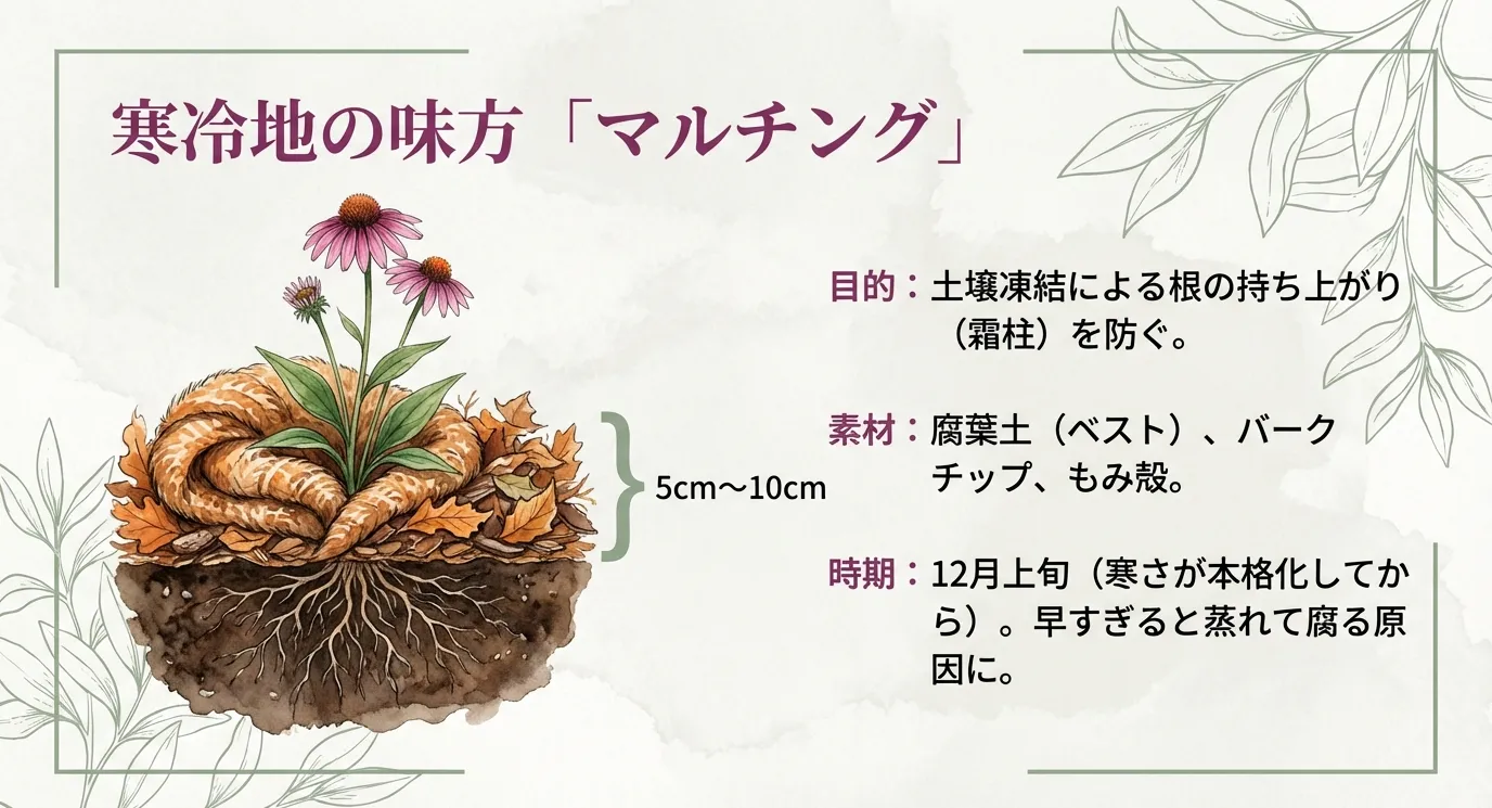 エキナセア自体は耐寒性に優れていますが、土壌が深く凍結して根が持ち上げられたり、凍結と解凍を繰り返すことで根が傷んだりするのを防ぐために、断熱材の役割を果たすマルチングが非常に有効です。