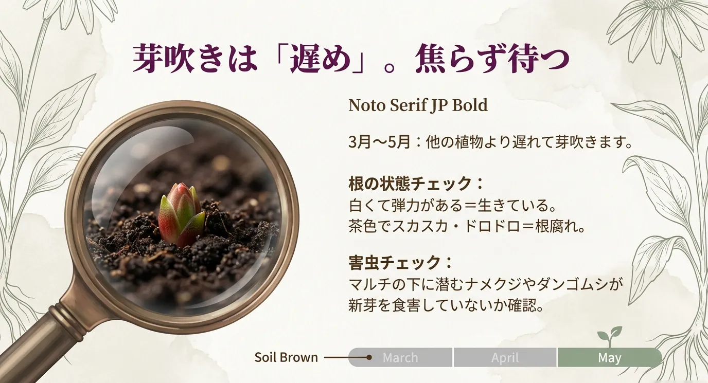 地温が十分に上がらないと動かないため、焦りは禁物です。しかし、5月になっても変化がない場合は、何らかの原因で冬越しに失敗した可能性があります。