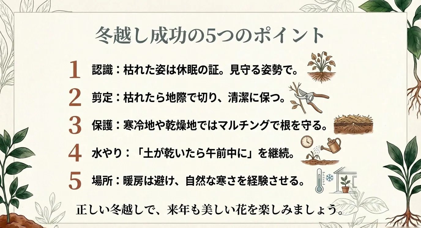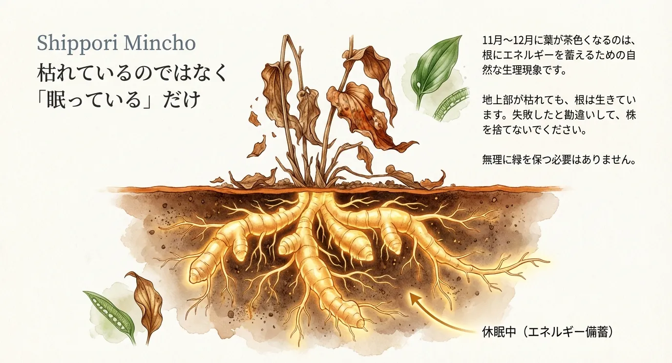 この時期に「枯れたから」とあきらめて株を掘り起こしたり、水やりを完全にやめてしまったりしないことが、冬越しの第一歩となります。