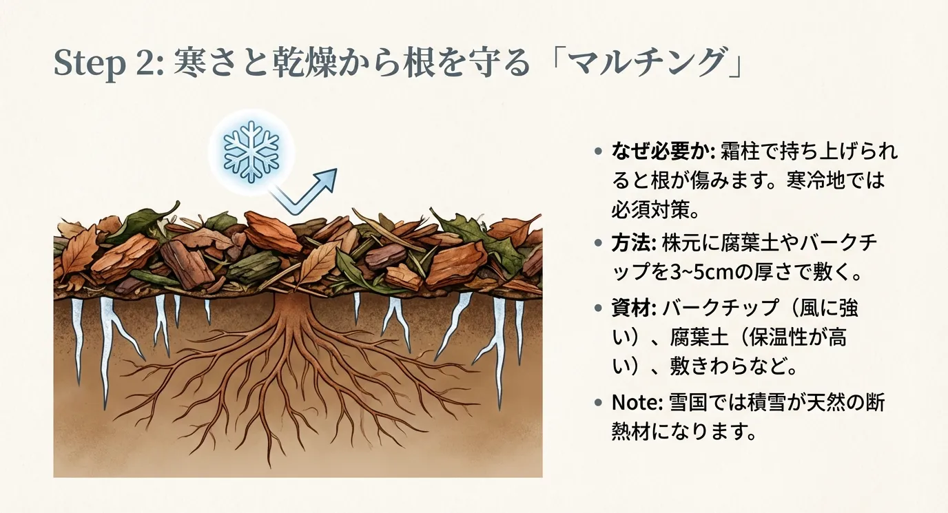 特に冷え込みが厳しい地域や、霜柱が立ちやすい場所では「マルチング」が非常に有効です。マルチングとは、土の表面を何らかの資材で覆うことで、地温の低下を防ぎ、水分の蒸発を抑える手法を指します。