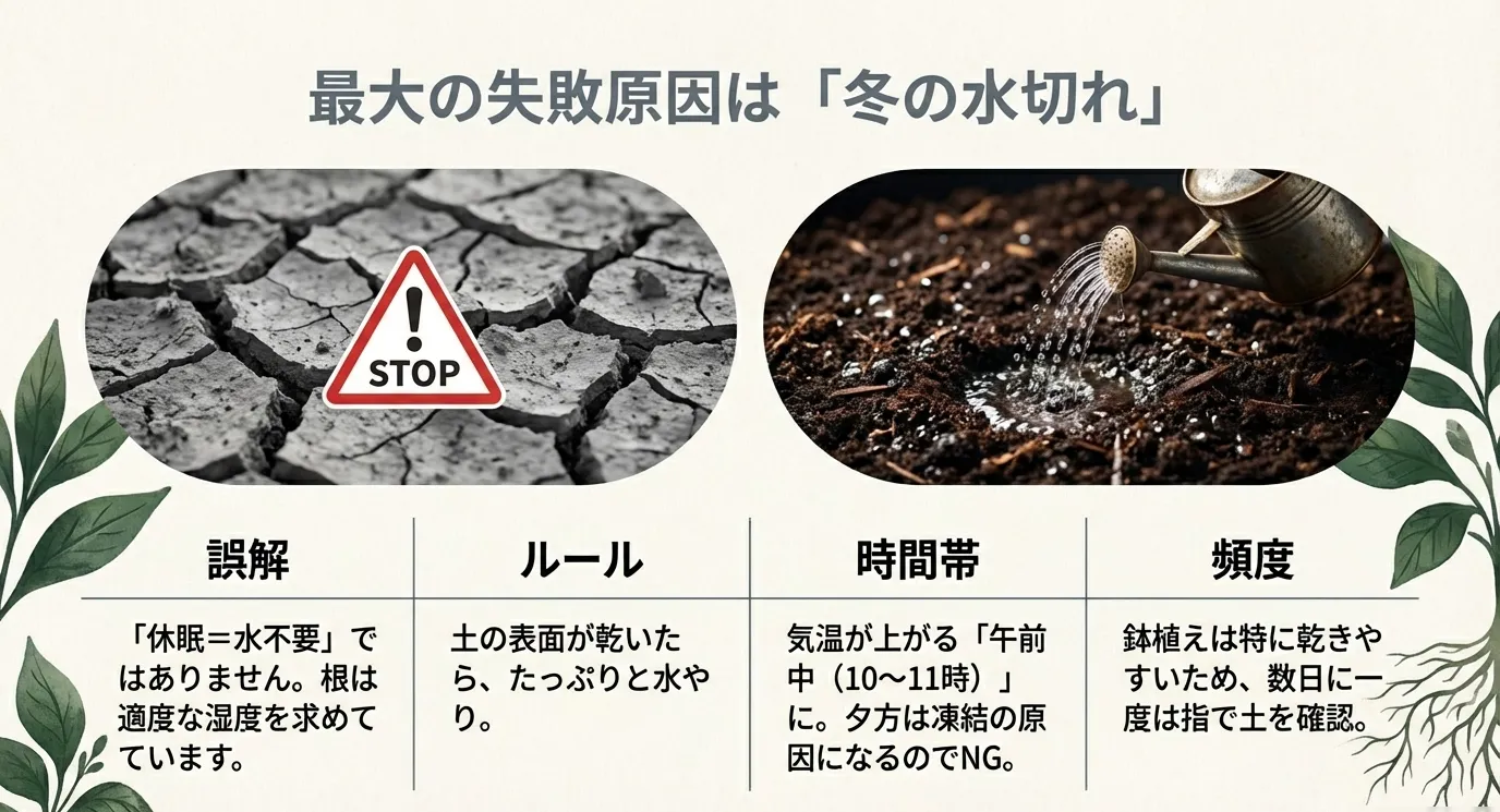 「冬は寝ているから水はいらない」という誤解を解き、根の健康を保つための最小限のケアを続けていきましょう。