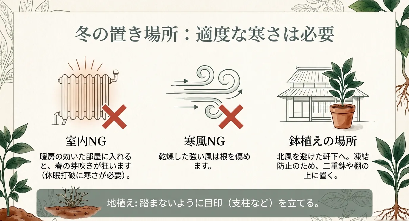 - 休眠期に自然な寒さに当てることで春の芽吹きが良くなる