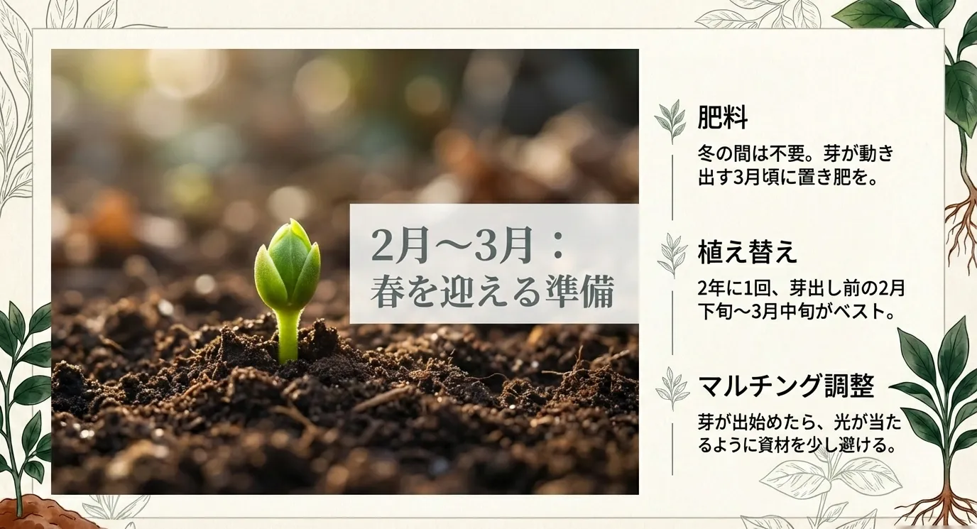 - 春の芽吹きを助ける肥料と植え替えの準備