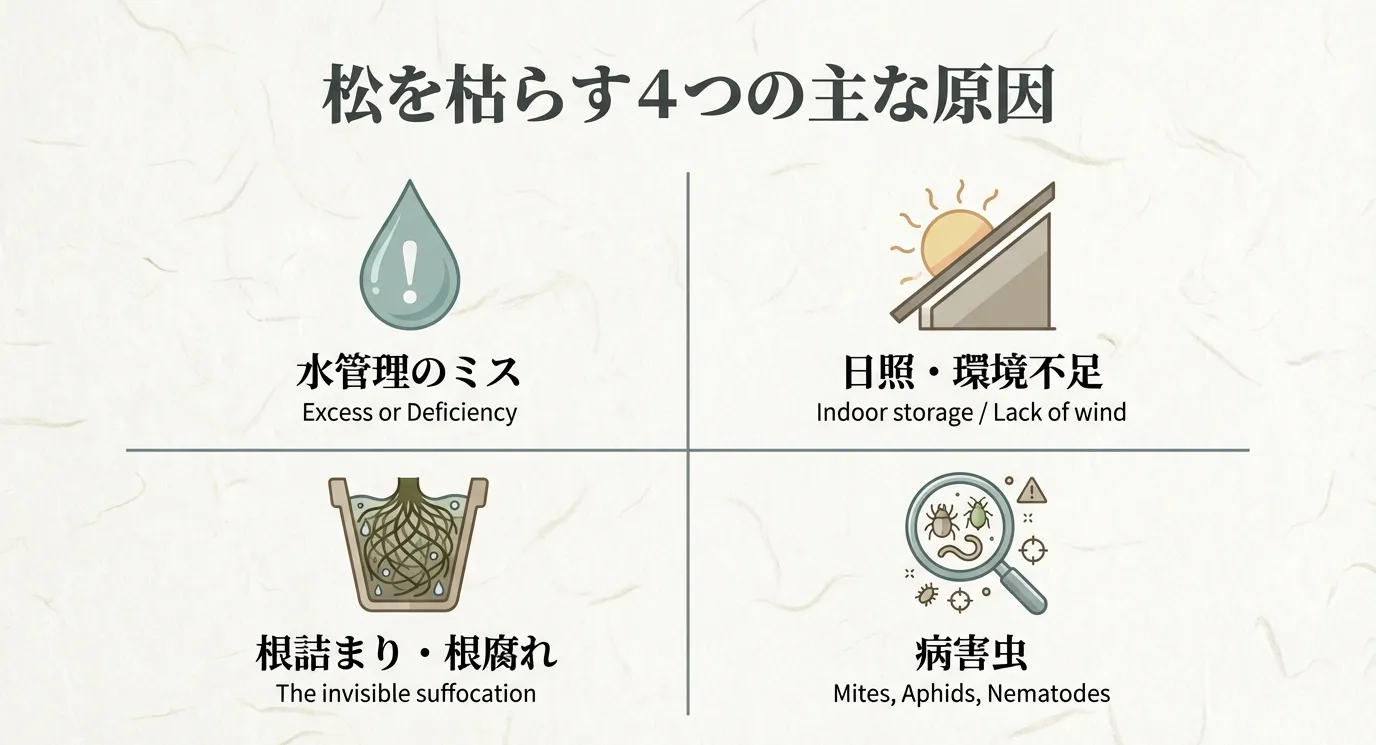 盆栽の代名詞とも言える松ですが、ある日突然、葉が茶色くなって元気がなくなると、どうしていいか分からず不安になるものです。松が枯れるのには、必ず植物生理学的な理由があります。