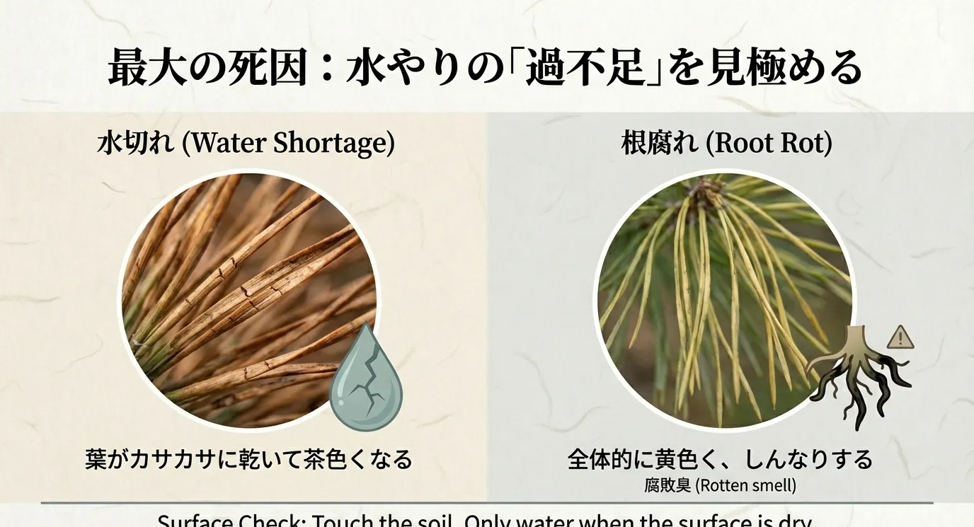 松の盆栽が枯れる原因として、最も頻度が高いのが水やりのミスです。ここで厄介なのは、「水を与えすぎた場合」と「不足した場合」の両方が枯死に直結する点です。水不足、いわゆる水切れを起こすと、松の葉は乾燥してカサカサになり、最終的には茶色く変色して落ちていきます。松は比較的乾燥に強いイメージがありますが、鉢植えという限定された環境では、一度完全に乾ききってしまうと、細胞が破壊されて水分を吸い上げる力がなくなってしまいます。特に夏場の猛暑下では、朝にたっぷり与えても午後には乾いてしまうことがあり、注意が必要です。