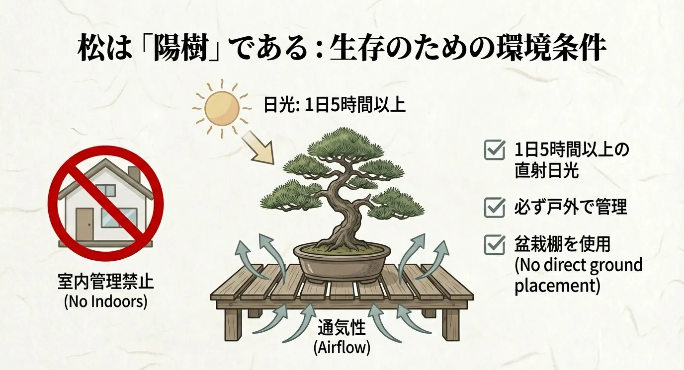- 松は太陽を愛する陽樹であり戸外管理が栽培の基本である