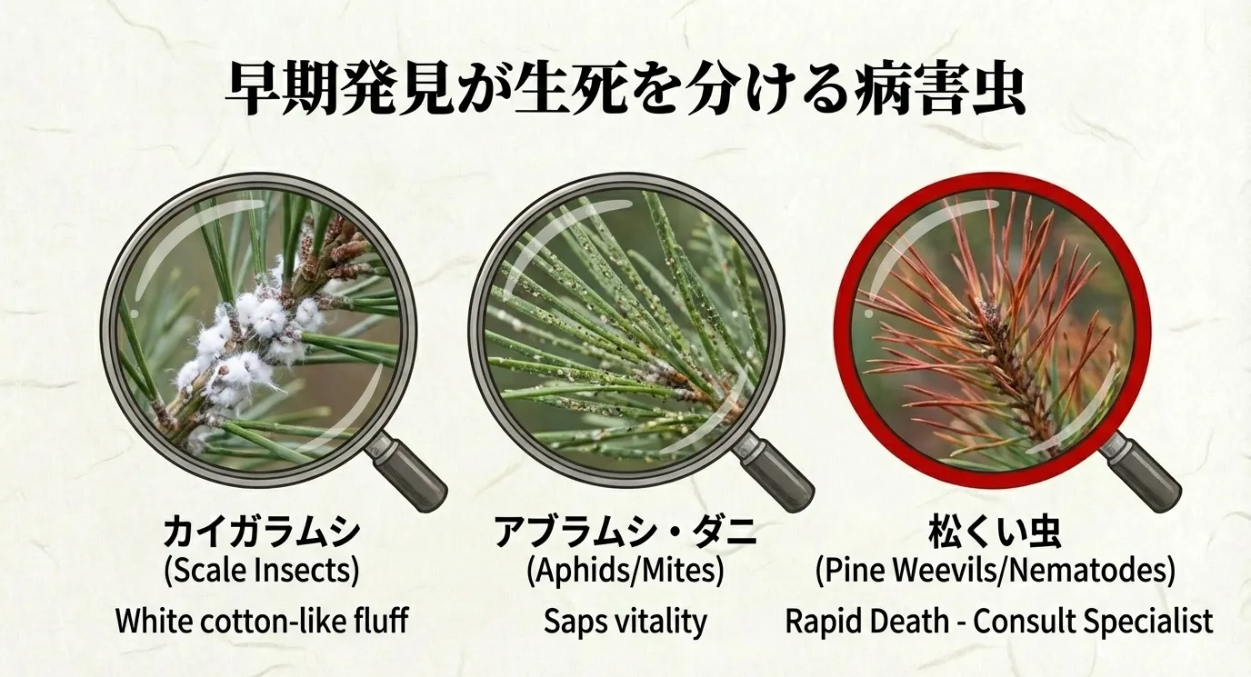 これらは松の汁を吸ったり、葉を食害したりして樹勢を弱めます。特にカイガラムシは、白い綿のようなものが付着しているように見え、一見すると病気か汚れのように思えますが、放置すると枝枯れを引き起こします。