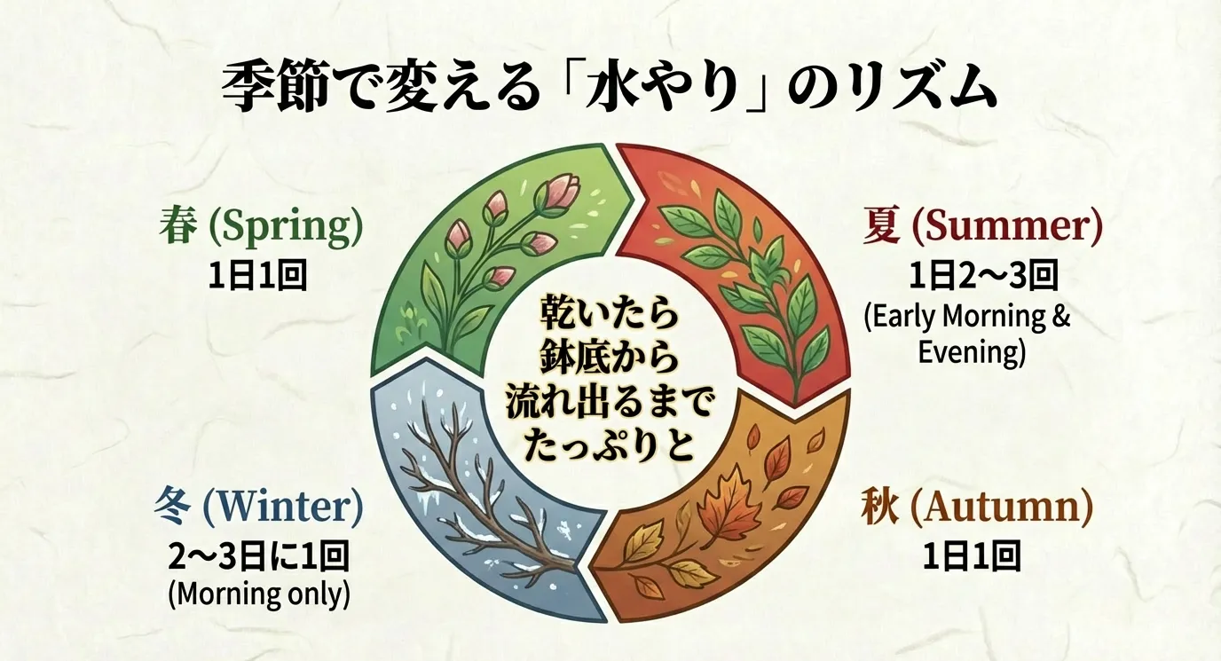 | 春 | 1日1回 | 芽吹きが始まるため、乾燥させないように注意する |