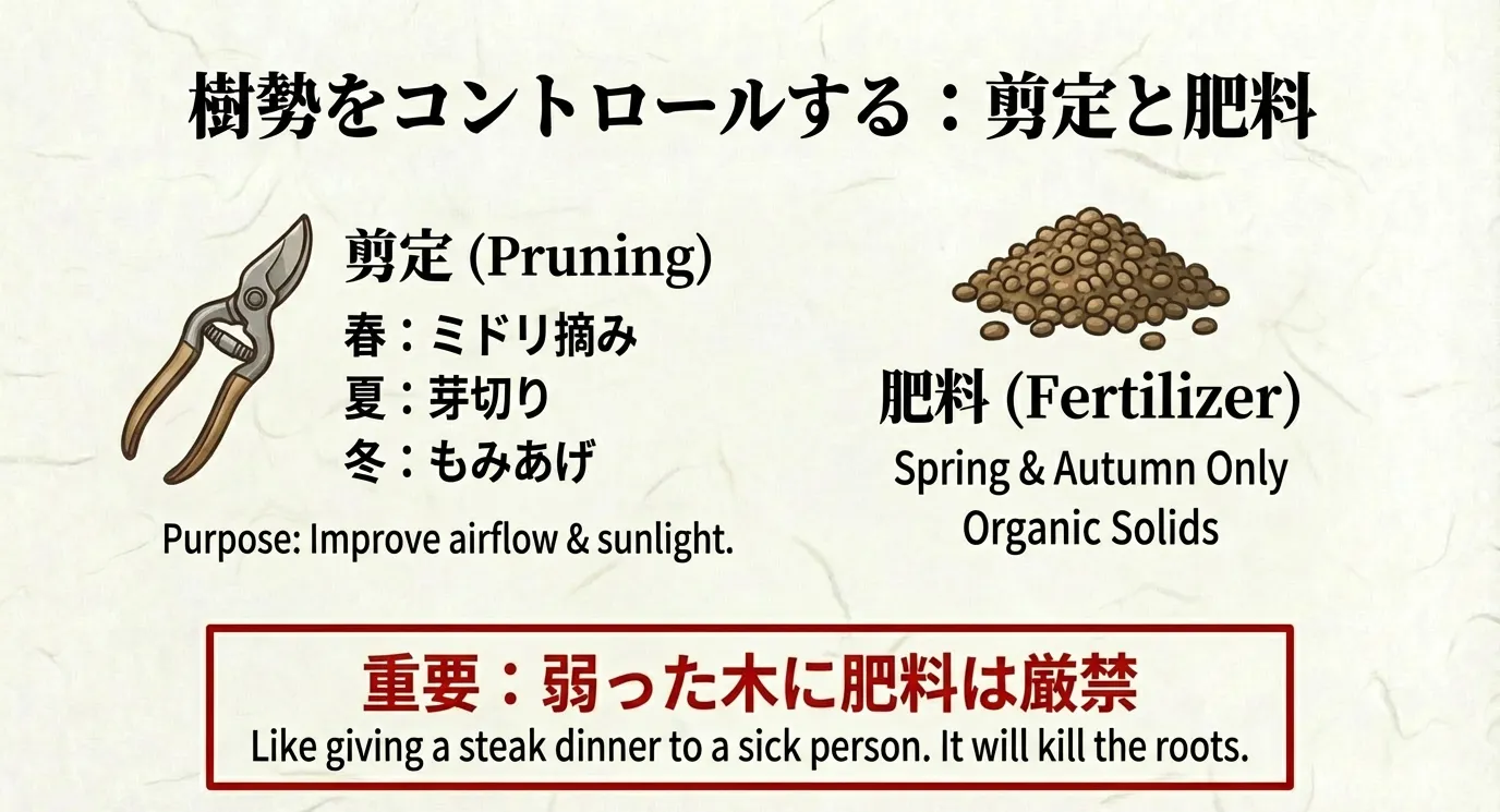 - 剪定と芽摘みで樹勢をコントロールする技法