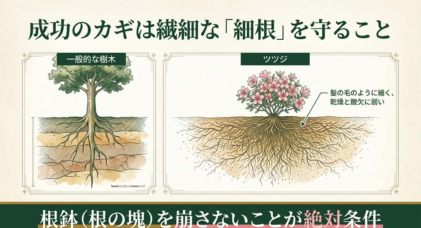 ツツジの根は太い主根が少なく、綿毛のような細い根がびっしりと地表近くに広がっています。この細い根が水分や養分を吸収する主力であるため、これらを切断しすぎないことが成功の鍵となります。