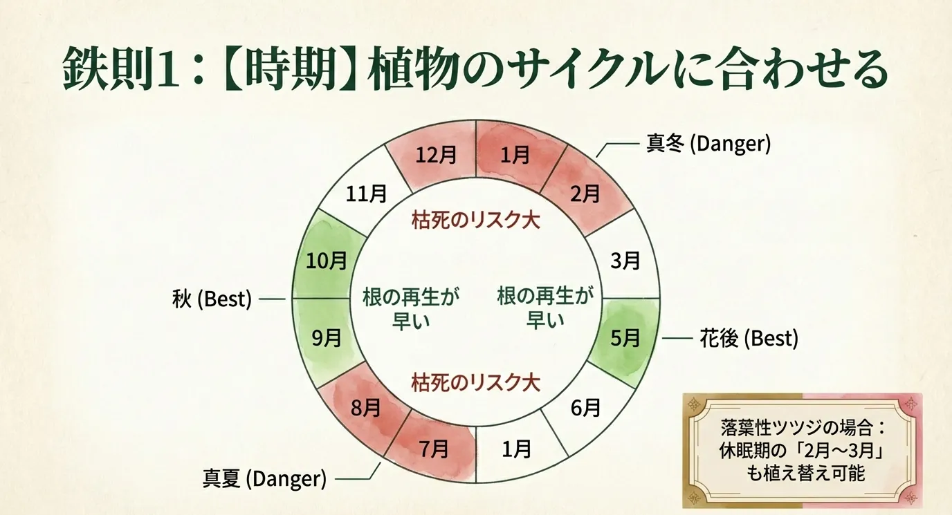 植え替えは、人間で言えば大きな手術のようなものです。患者(ツツジ)の体力が最も充実しており、かつ気候が穏やかな時期を選ぶことこそが、失敗を防ぐ最大の秘訣なのです。
