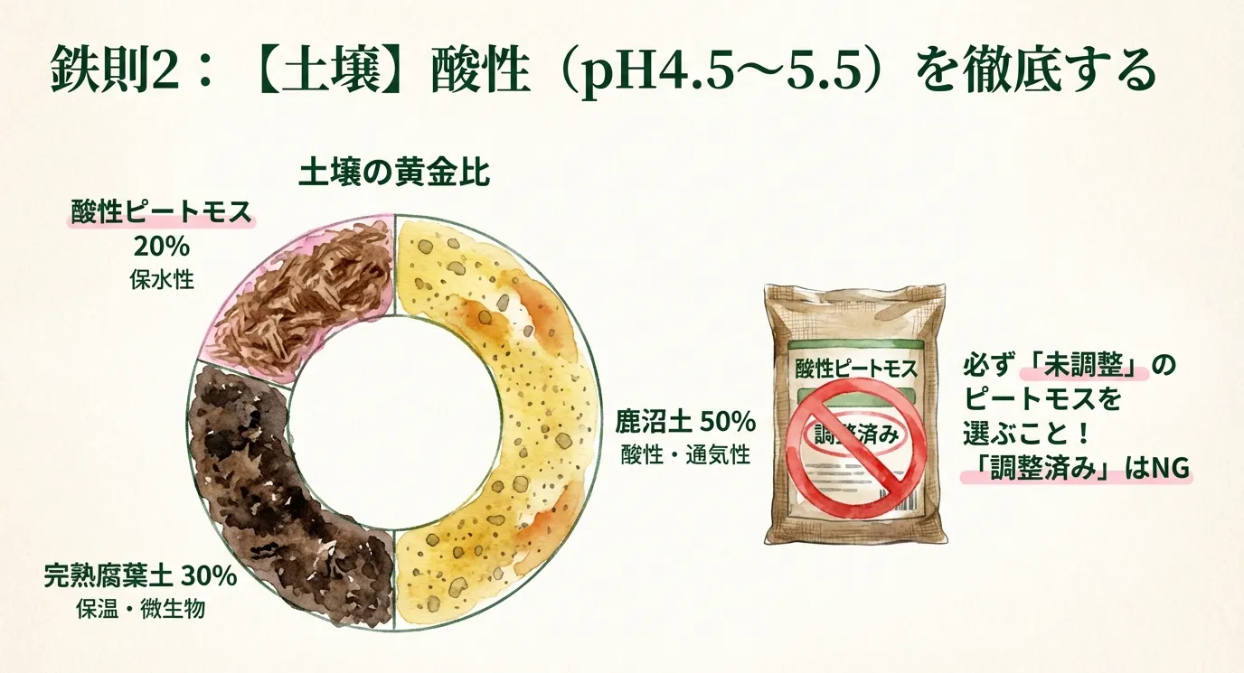 - 鹿沼土をベースにした酸性土壌(pH4.5〜5.5)の作成が成長の成否を分ける