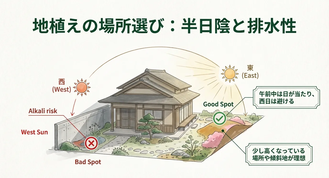 また、「排水性」と「保水性」という相反する二つの条件を同時に満たす場所が理想です。水はけが悪いと根腐れの原因になりますが、完全に乾燥してしまうと細い根がすぐに枯れてしまいます。