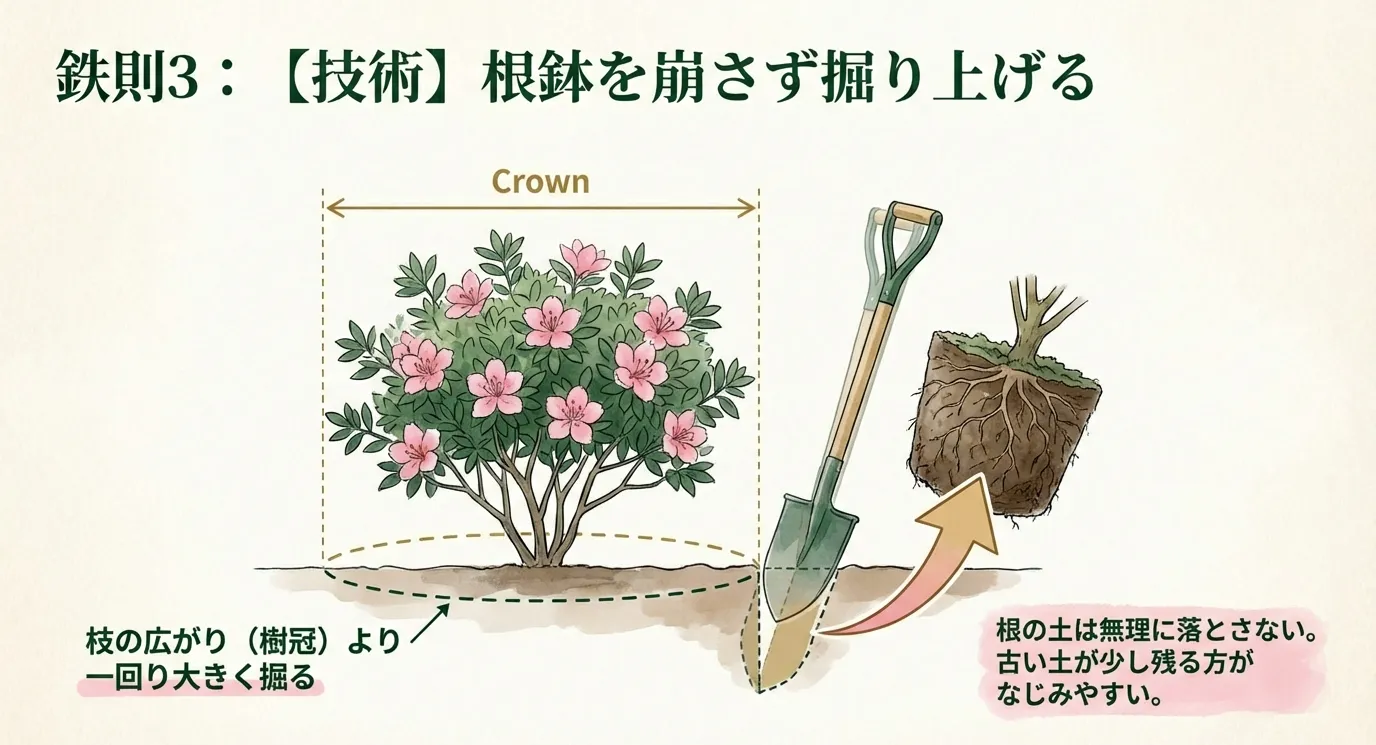 - 繊細な「細根」を傷めないための丁寧な掘り起こしと、根鉢を崩さない扱いが重要