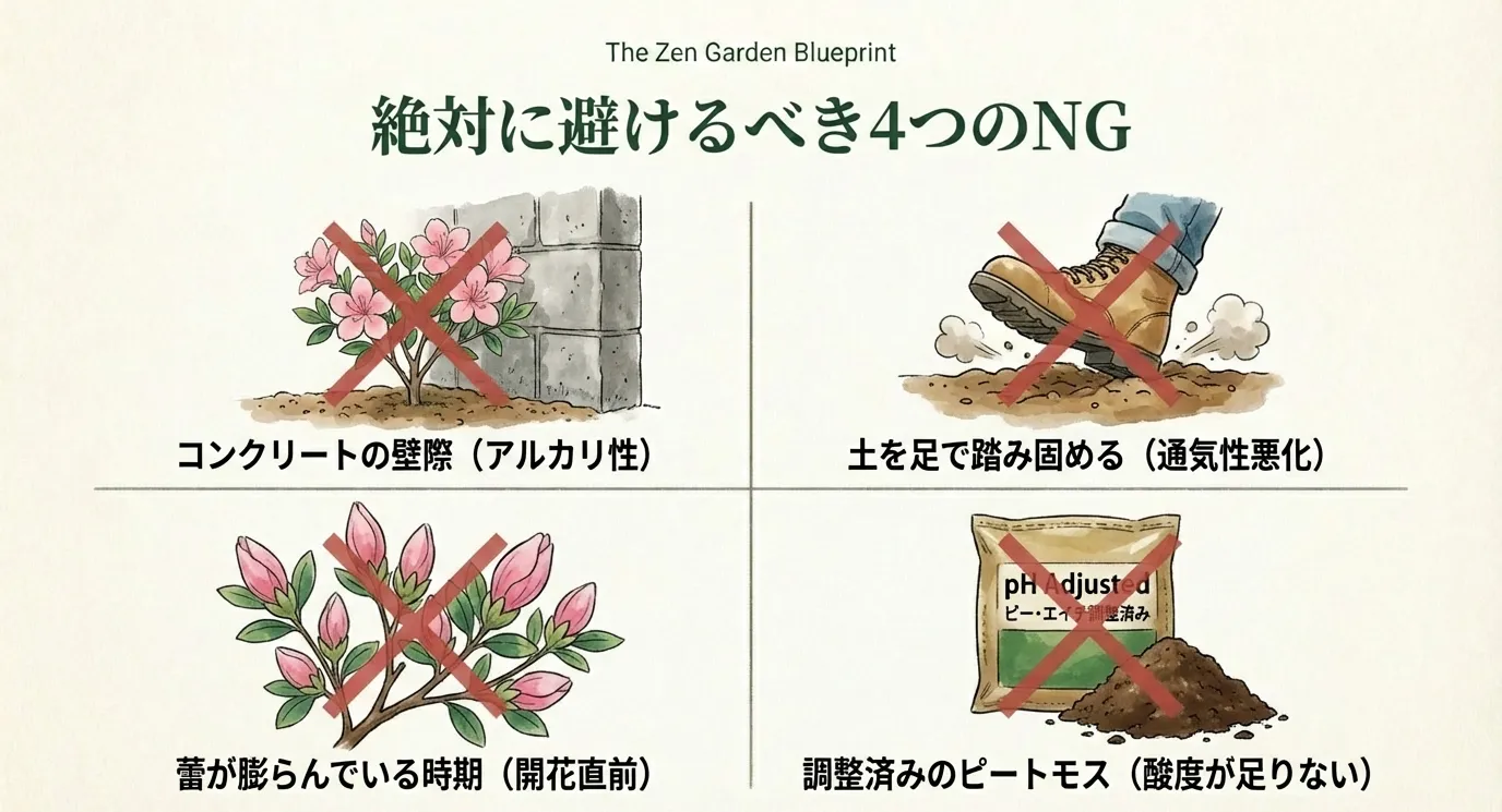 ツツジの植え替えにおいて、絶対に避けるべき時期というものも存在します。それは「真夏の猛暑期」と「真冬の厳寒期」、そして「開花直前」です。これらの時期に無理に作業を行うと、株が急激に弱り、最悪の場合は枯死に至る恐れがあります。