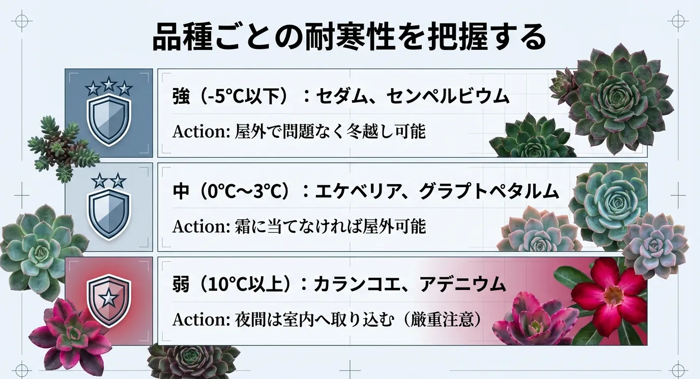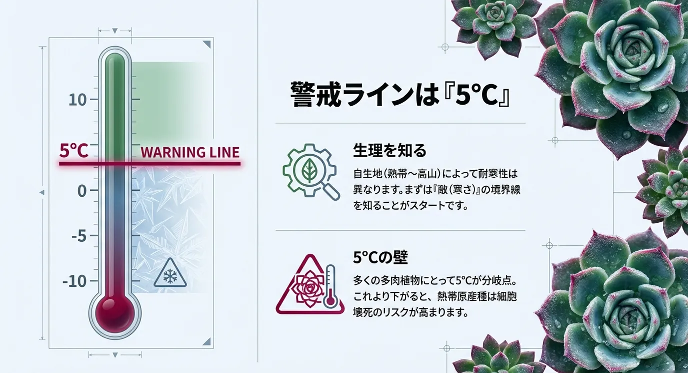 多肉植物と一口に言っても、その自生地は熱帯から高山地帯まで多岐にわたります。そのため、冬越しを成功させる第一歩は、自分が育てている植物がどの程度の寒さに耐えられるかを知ることにあります。