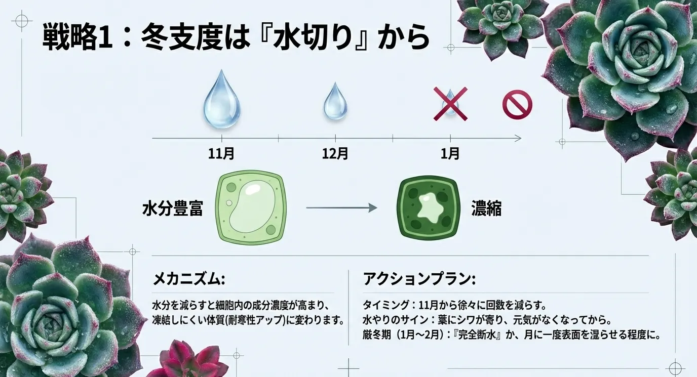 冬の多肉植物管理において、最も失敗が多いのが水やりです。冬は気温が低いため土が乾きにくく、根が水分を吸い上げる力も弱まっています。この時期に夏場と同じ感覚で水を与えると、根腐れを引き起こすか、あるいは植物の耐寒性を著しく下げてしまう結果になります。
