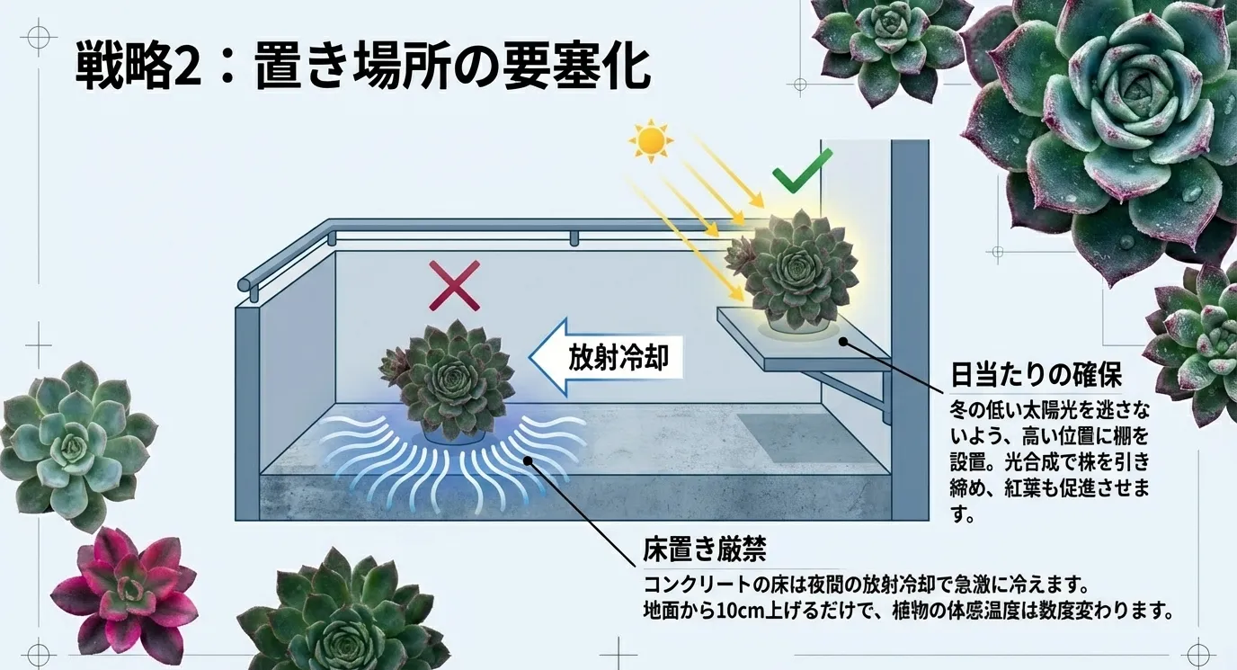 ただし、ベランダ特有の床冷えには細心の注意が必要です。コンクリートの床は夜間に放射冷却で急激に冷え込み、その冷たさは鉢を通じて直接根に伝わります。これを防ぐためには、鉢を床に直置きせず、フラワースタンドや木製の棚、あるいは発泡スチロールの板の上に置くといった工夫が効果的です。地面からわずか10センチメートル高くするだけで、滞留する冷気から逃れることができ、体感温度は数度変わります。