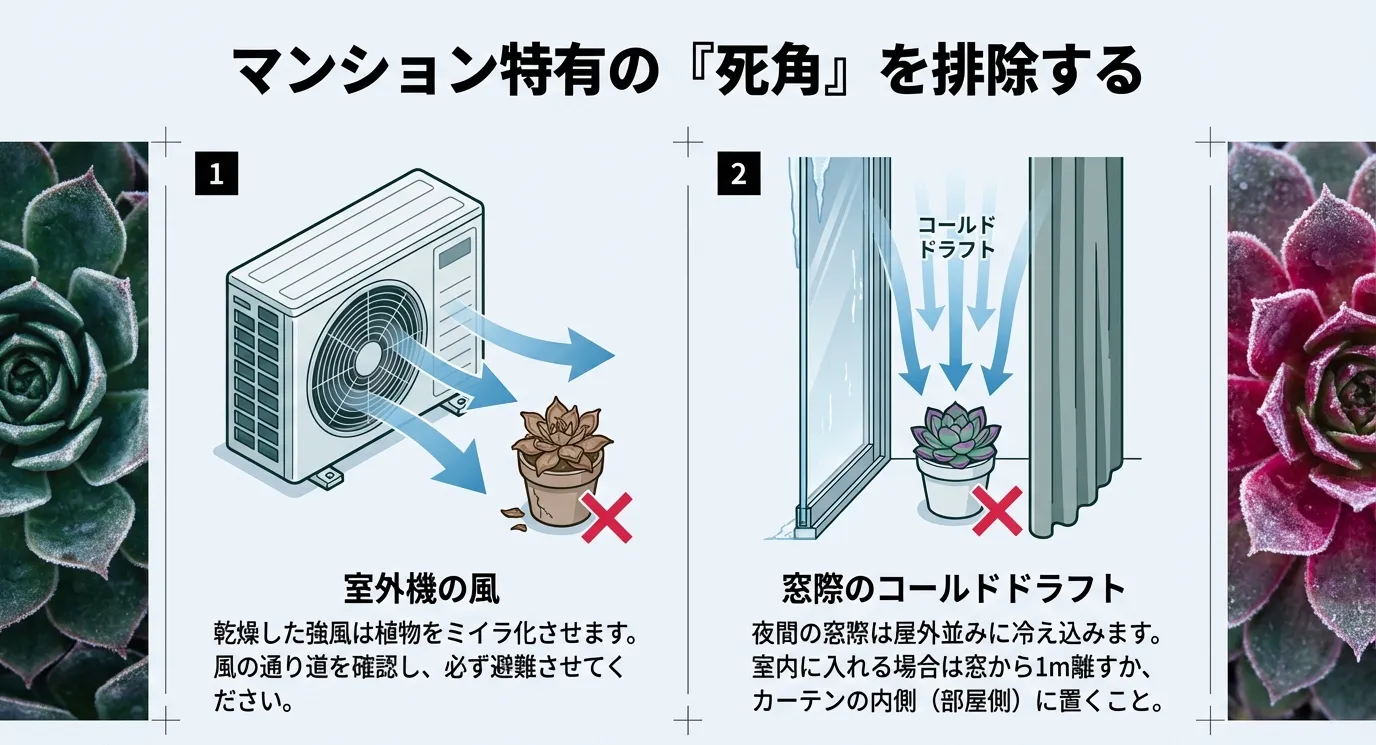 マンションのベランダで多肉植物を育てる際、意外と見落とされがちなのがエアコンの室外機から出る「風」の影響です。冬場に暖房を使用すると、室外機からは冷たい強風が吹き出します。この風が直接植物に当たると、急激に株が冷やされるだけでなく、植物が必要としている最低限の水分まで奪い去ってしまいます。