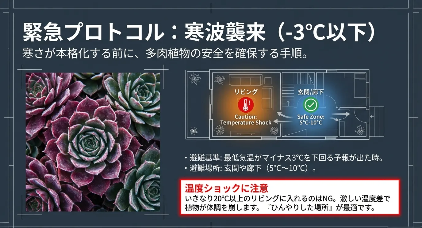 避難の際のコツは、完全に暖かい部屋に入れるのではなく、玄関や廊下といった「5℃から10℃程度のひんやりした場所」を選ぶことです。20℃を超えるリビングなどに急に入れると、植物が激しい温度変化に驚き、体調を崩してしまいます。
